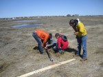 The classic locality for this research in New England is the Succotash Salt Marsh in beautiful Rhode Island. I recently had the good fortune to visit this marsh with a Brown geology class. Our goal was to use muscles and sledgehammers to retrieve sediment cores from the marsh in order to identify when the big storms hit. Remarkably, Hurricane Sandy was not powerful enough in Rhode Island to leave a trace of sand on top of Succotash Marsh. Follow the pictures below to see the step-by-step process of salt marsh coring.