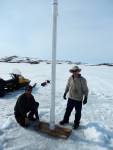 - Punching holes is a team effort. With this much ice, it is important that we drill straight down so that the coring gear goes straight down into the mud. (photo WML)