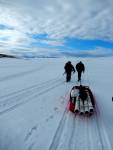 - Longo and Jim use an auger in Upper Capsule Lake, with the Brooks Range Mountains and Yongsong in the background.