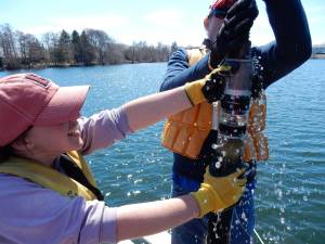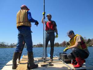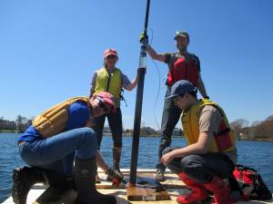 The goal of this coring endeavor is to use ancient DNA, preserved in a sediment core, to learn about how this pond has been impacted by residential development since the pilgrims arrived at Cape Cod. Here Longo, Morgan, and Steve, the three IGERT students, work to sample the sediment for DNA. The need to be verrrry clean and not sneeze on anything.