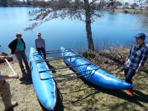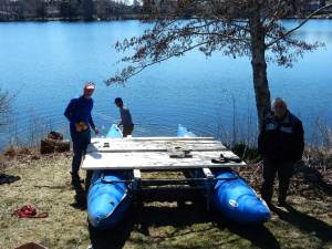 Our coring platform consists of two pontoon floats, metal crossbars, and 2×6’s. It is very stable and plenty big for 4 workers.