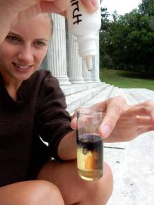 Visiting scholar Carolynn Harris volunteering to measure dissolved oxygen concentration using a Hach kit. Here she is adding starch color indicator.