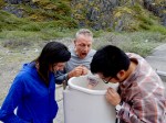 - Isla, Boyang, and JD inspect the interval sediment trap.