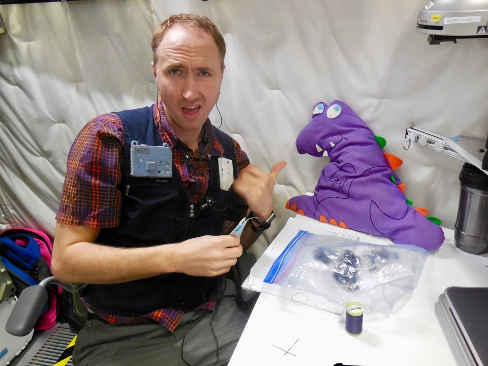 Doing some sewing repairs with my dino friend