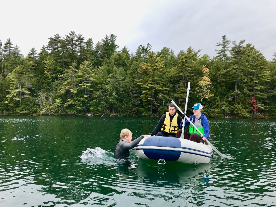 Dan bravely prepares to work on the sediment trap from the water.