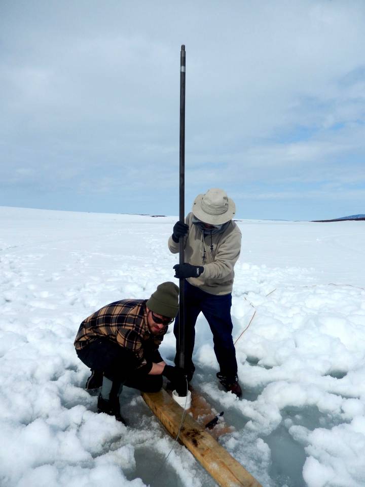 core-2 ← Previous Next → Will Longo and Yongsong Huang lower the core barrel to the sediment by attaching a series of 2 m rods.