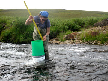 Ebucket ← Previous Next → Stream monitoring of benthic algae, invertebrates, and fish including YOY (young of year) can be a lot of work and a lot of fun. This shot is from the Kuparuk River, which empties into the Arctic Ocean.
