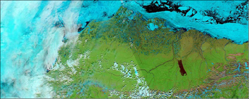 eur34461 ← Previous Next → The dark area is the site of the 2007 Anaktuvuk River Fire as viewed from space by the MODIS satellite. From NASA/GSFC.