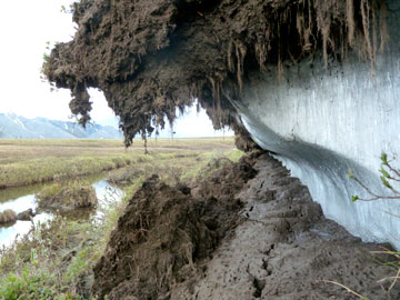 Galbraith_TK_1 ← Previous Next → The same ice wedge with overlying soil and roots. The degraded soil and melted ice slumped directly into the stream visible in the background.