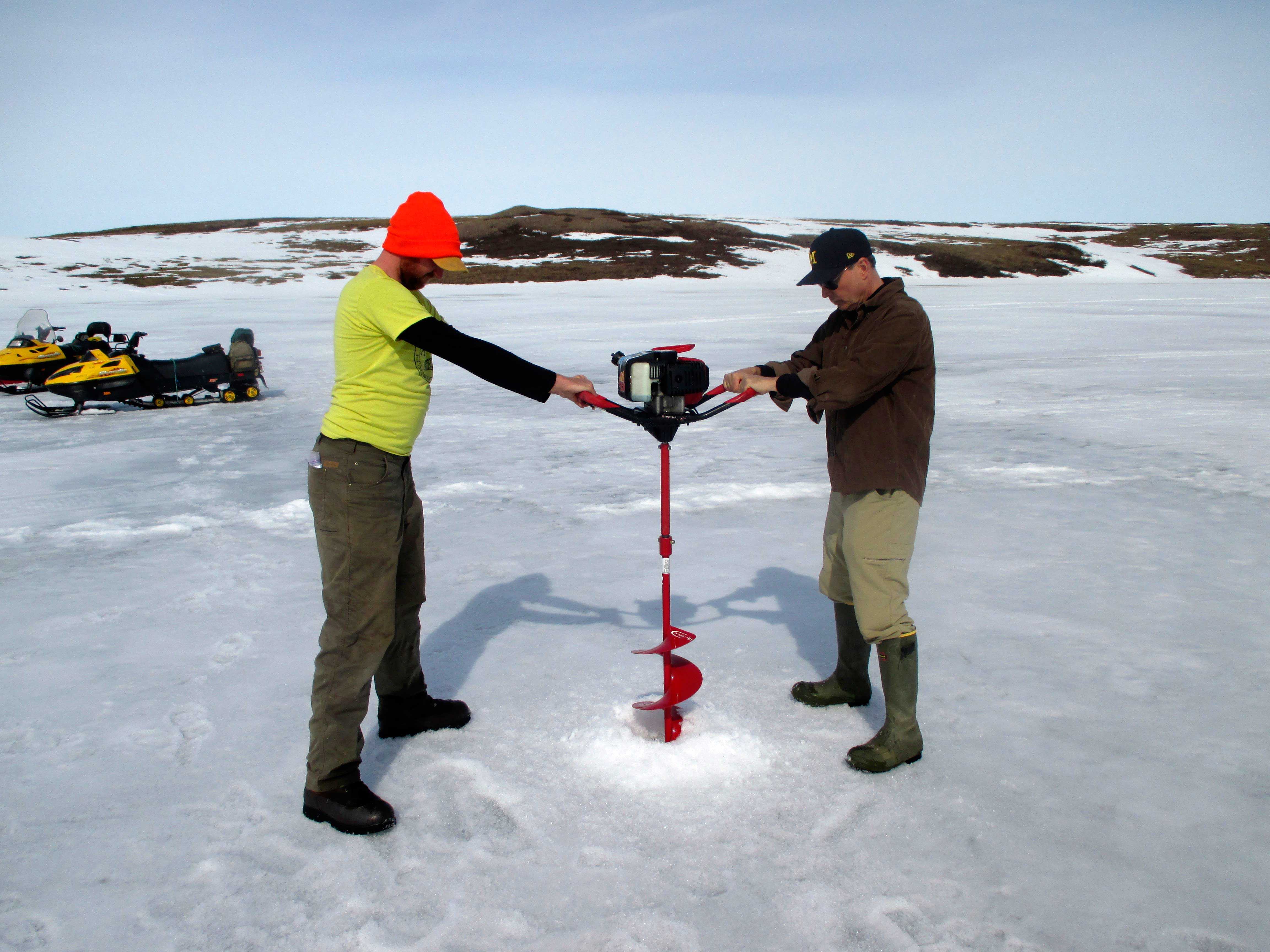 kling-wl ← Previous Next → Punching holes is a team effort. With this much ice, it is important that we drill straight down so that the coring gear goes straight down into the mud. (photo WML)