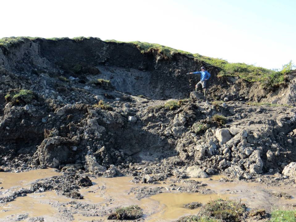 Jason Dobkowski points out an ice wedge in the thermokarst headwall